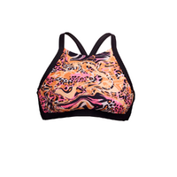 Featuring a high neck, wide underbust band, adjustable criss cross straps