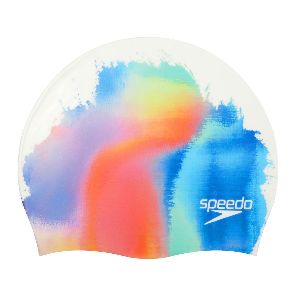 Speedo Digital Printed Silicone Swim Cap - White/Punch Blue/Nectarine , Silicon Swimming Cap, Swim Caps