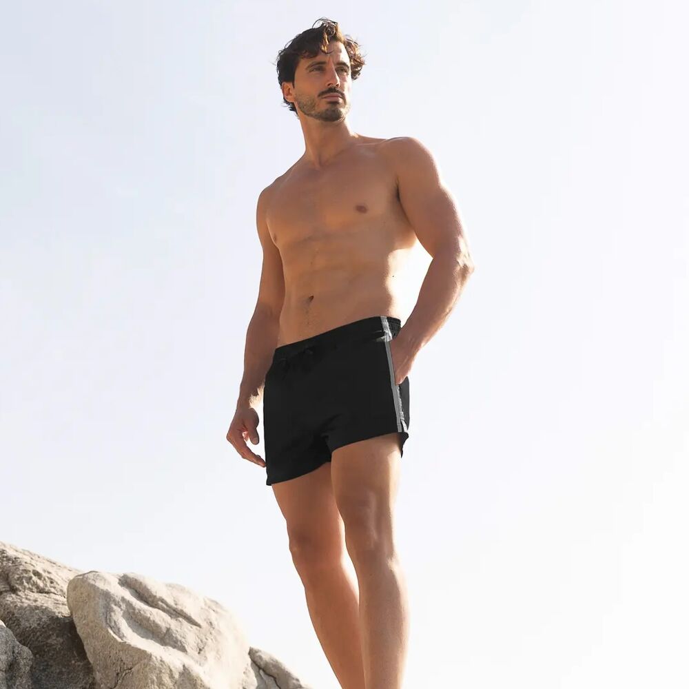 two side pockets and a back pocket. The contrasting grey taping on the side of these black shorts,