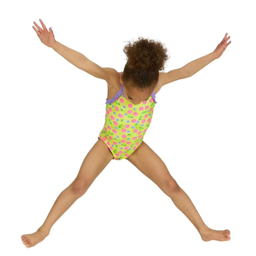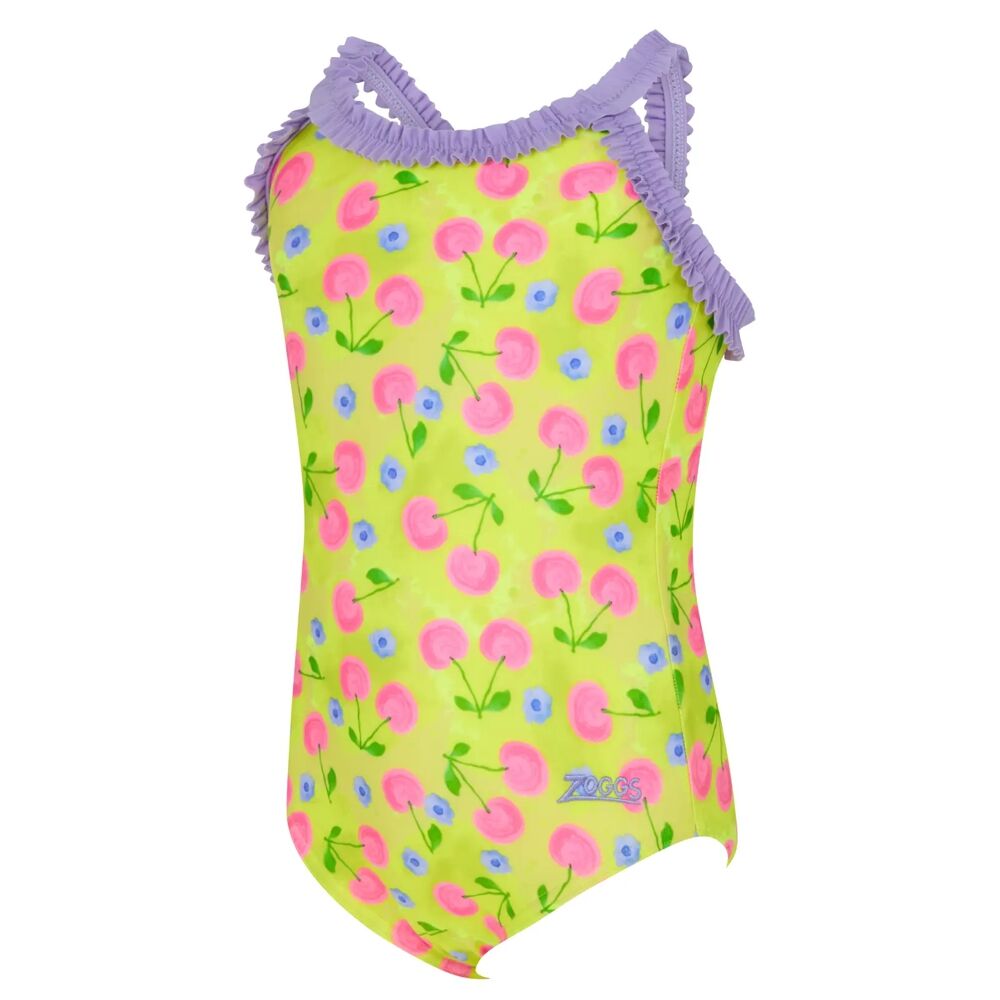 The Zoggs Cherries Ruffle Crossback features a stunning pink cherry print your little one is sure to love!